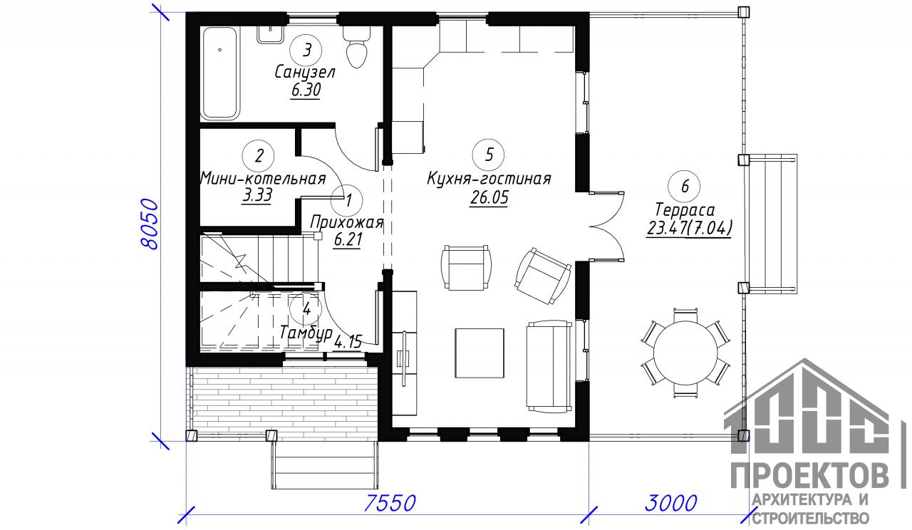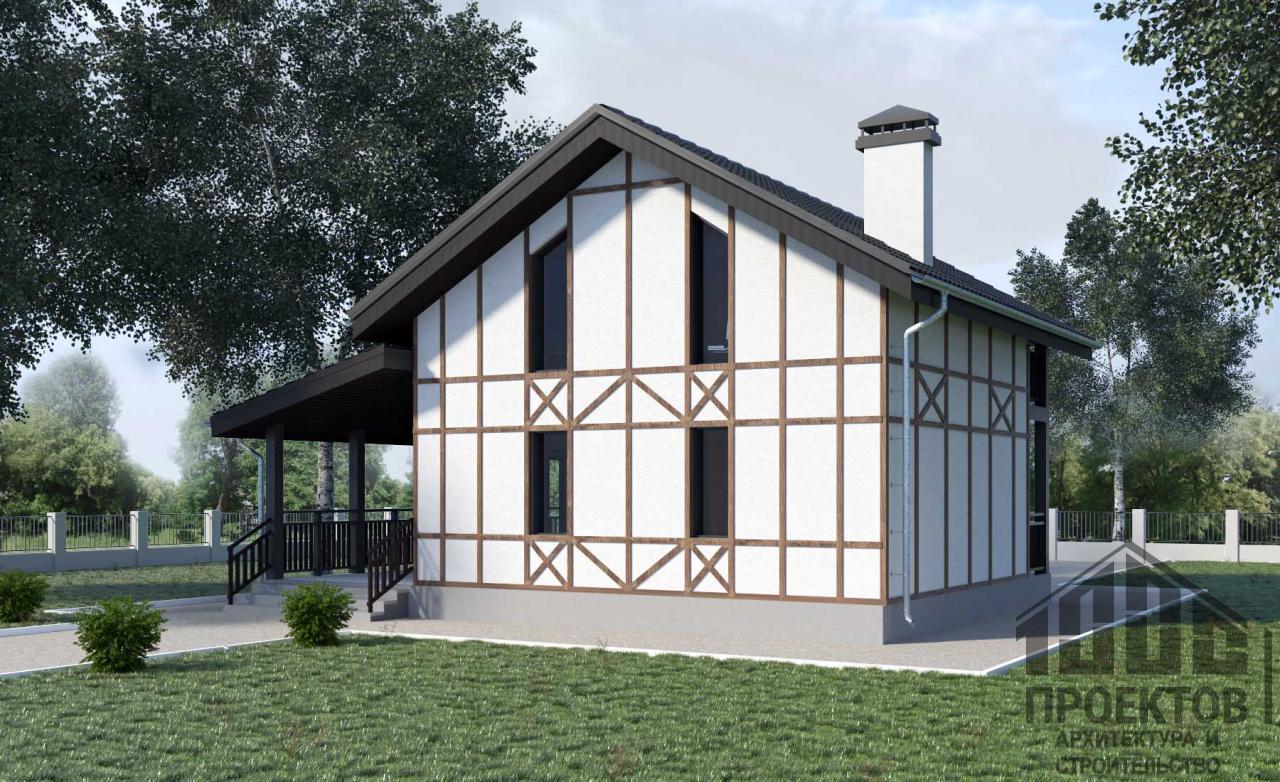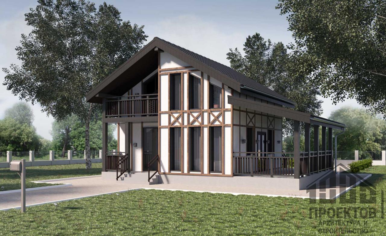 Проект каркасного дома площадью 96.84 м2. В доме один этаж с мансардой, где находятся кухня-гостиная, тамбур, мини-котельная, санузел, 2 жилые комнаты и балкон. На улице предусмотрена просторная терраса.